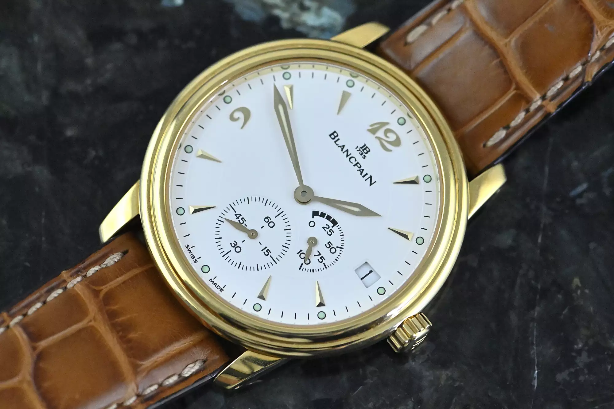 With a diameter of 36 mm and its classic look, this Villeret is a perfect dress watch for everyone. The watch also comes on the original Blancpain leather strap with the original Blancpain pin buckle in 18k yellow gold. The condition of the watch is very nice and unpolished (there is still a sticker on the case back) from the first owner.