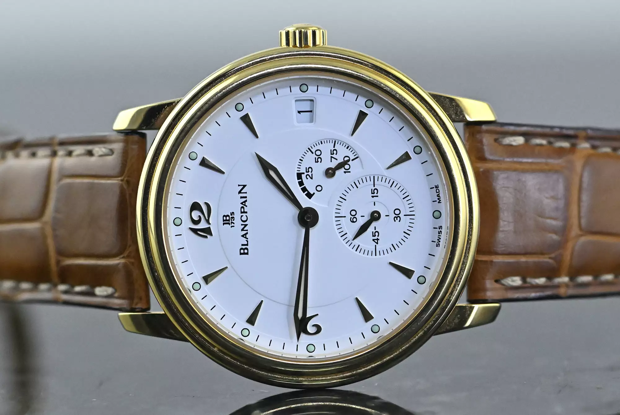 Stylish Blancpain Villeret 100-hour power reserve, with the reference 1106-1418-55 in 18k yellow gold. The watch features the Blancpain hand-wound calibre 1106 with date and 100-hour power reserve display. The beautiful white dial gives the watch a very elegant look, while the small seconds at 6 o'clock and the power reserve indicator at 4 o'clock add another interesting nuance.