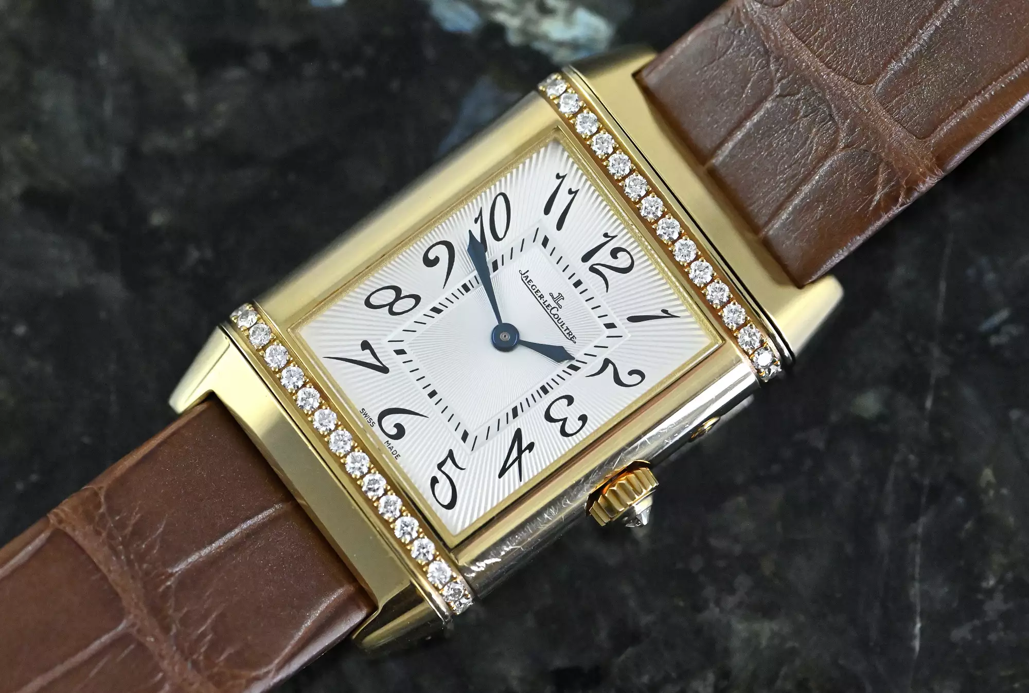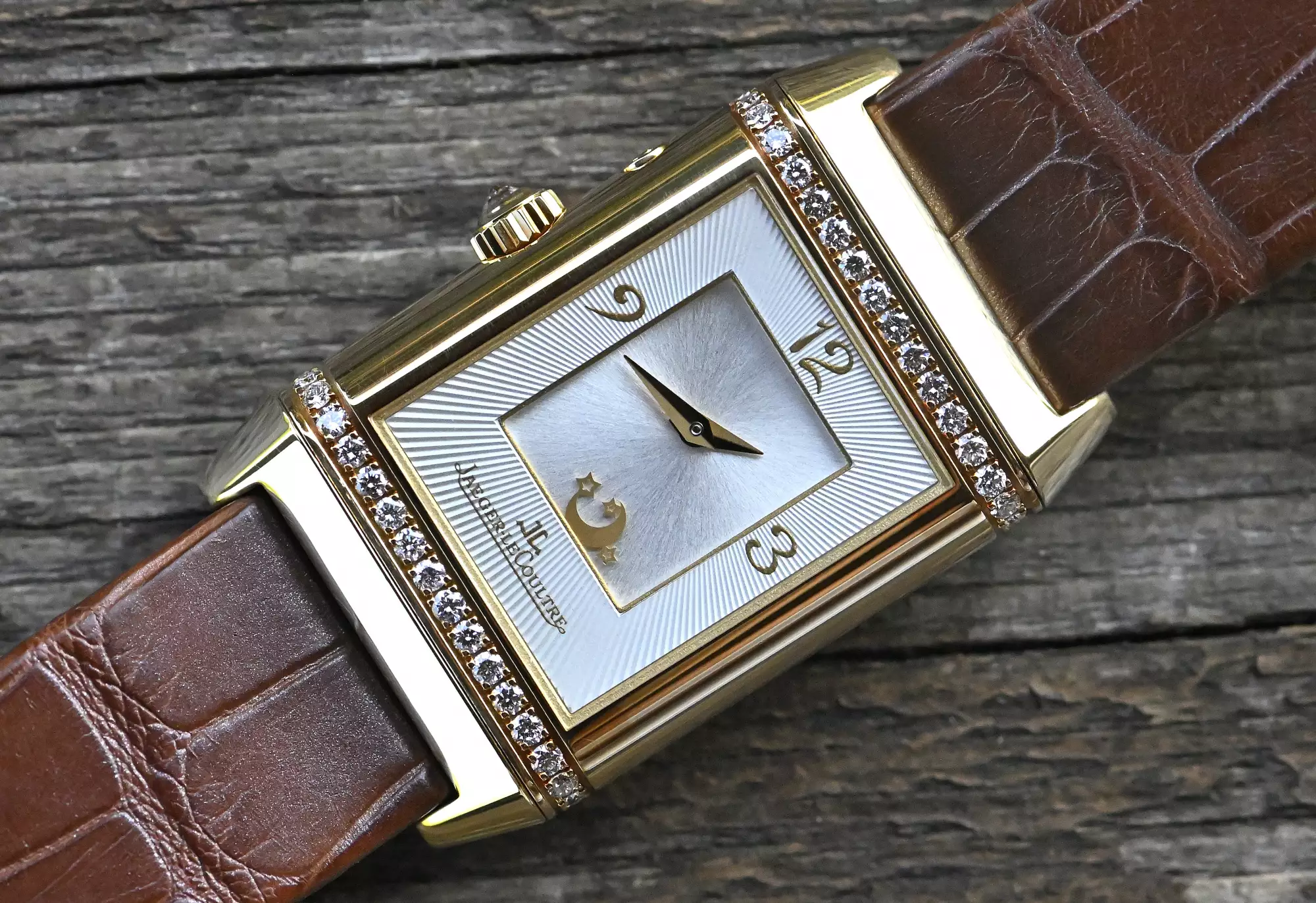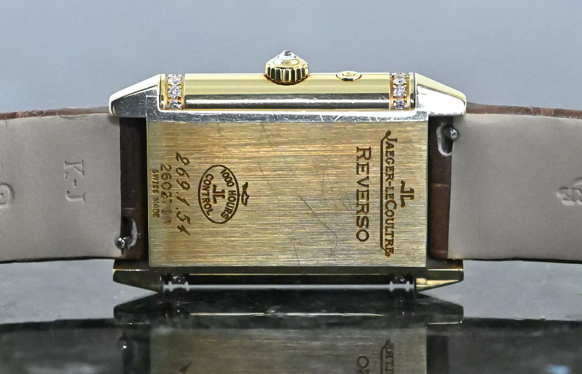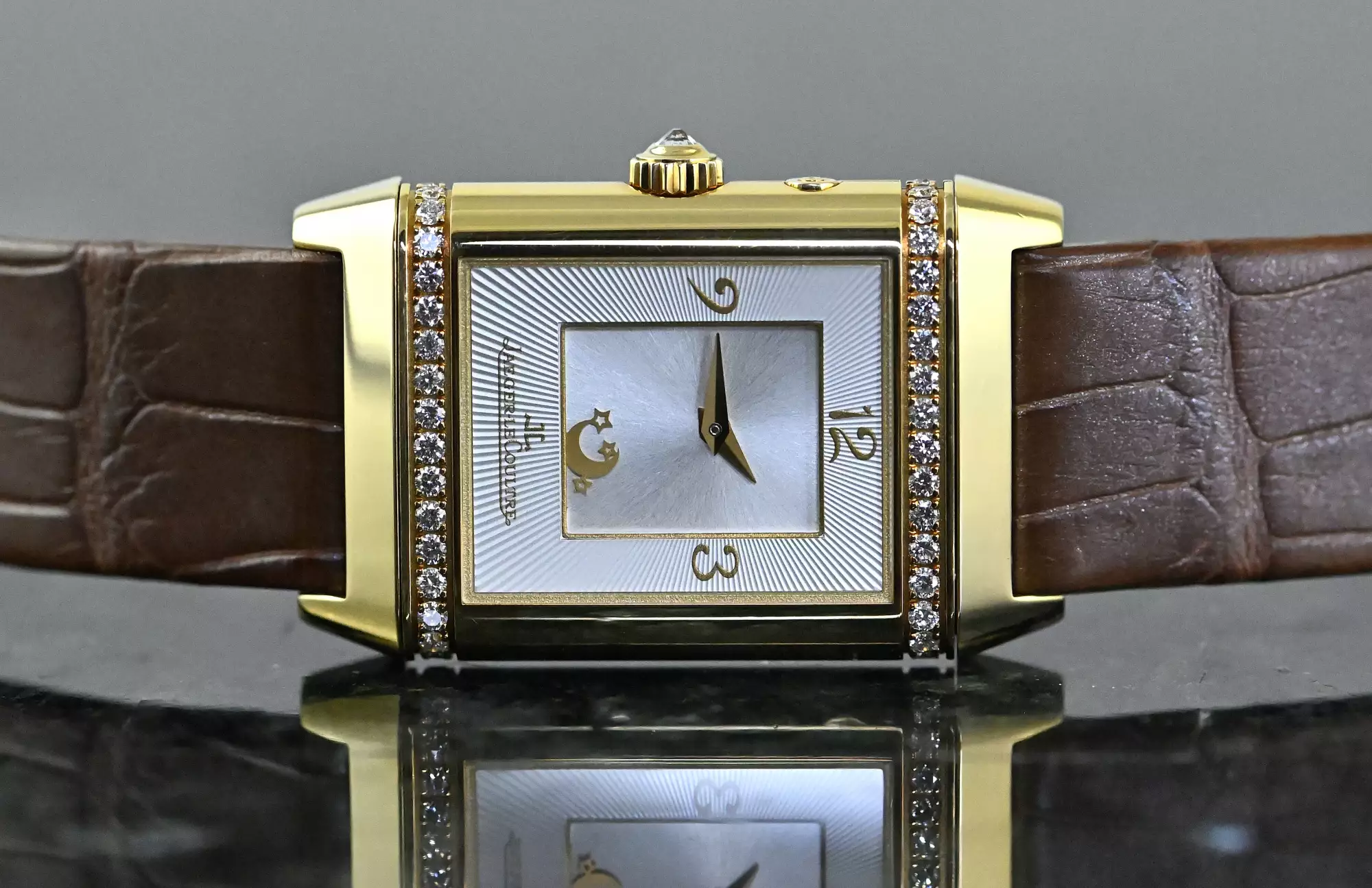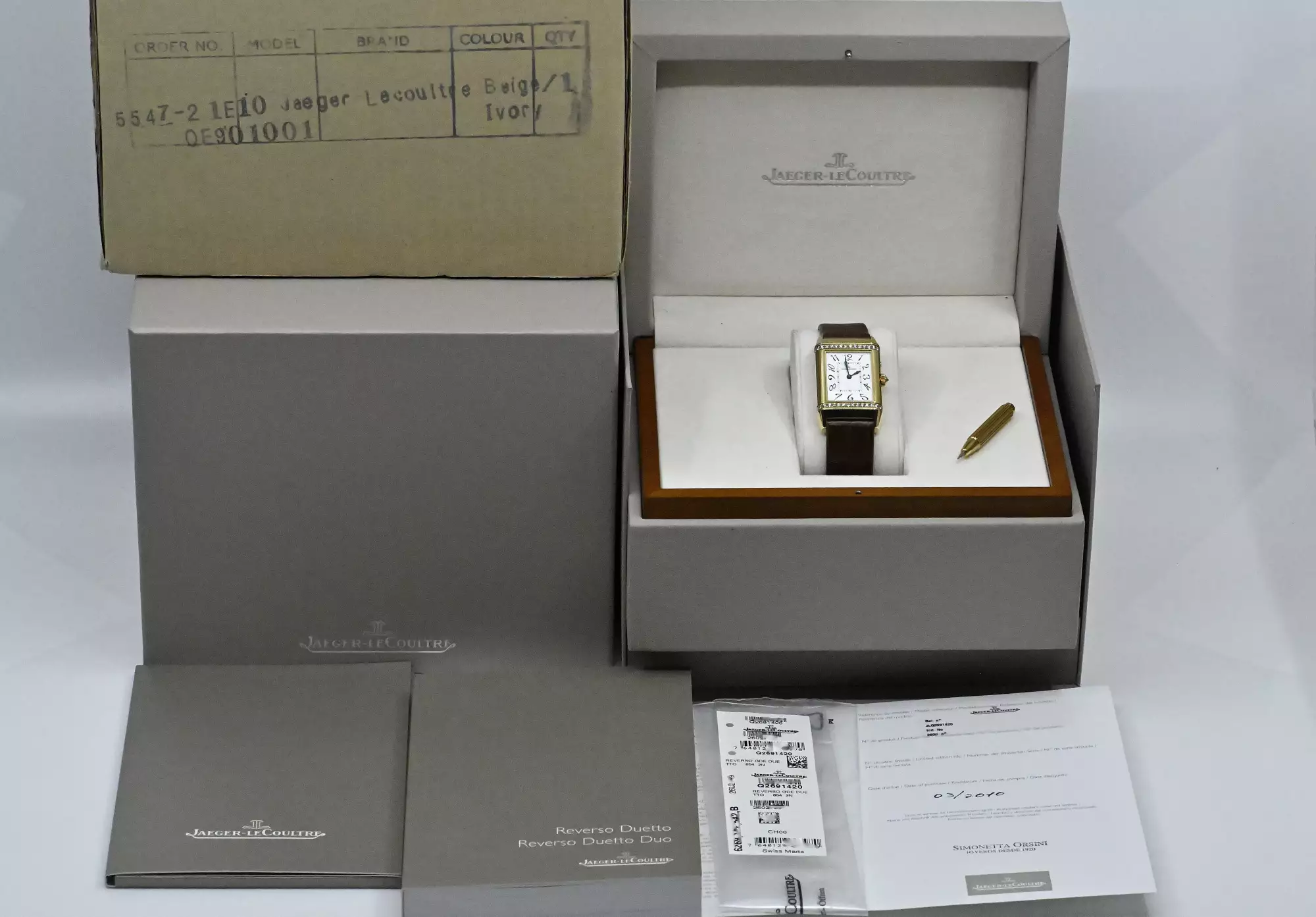 Elegant and stylish Jaeger-LeCoultre Reverso Duetto Duo ‘Diamond’ with reference 269.1.54 - Q2691420 in 18k yellow gold. Both sides of the 180° reversible JLC Reverso case are set with original JLC diamonds (a total of 64 diamonds on the front and back with approx. 1 carat), giving the watch a magnificent appearance.