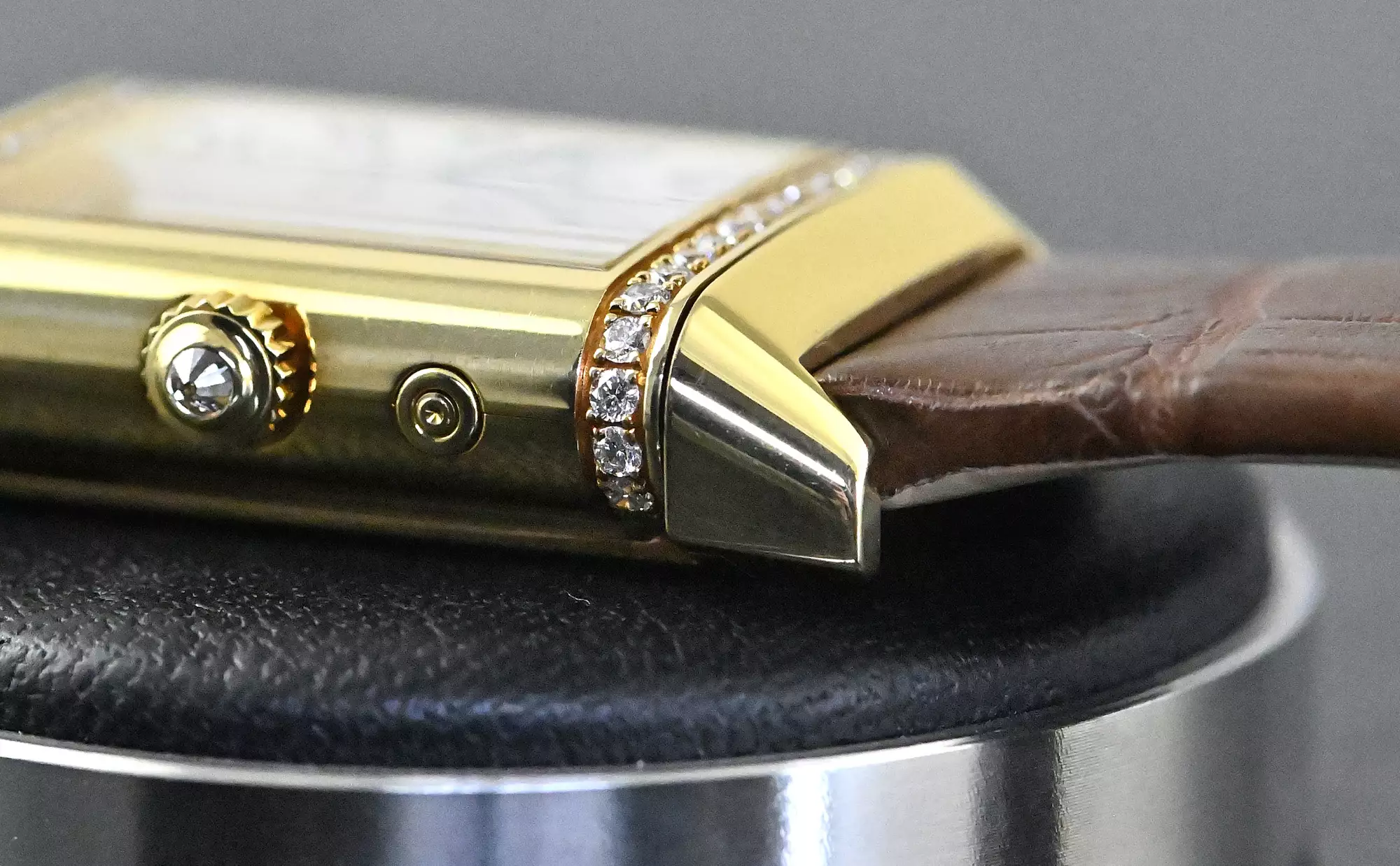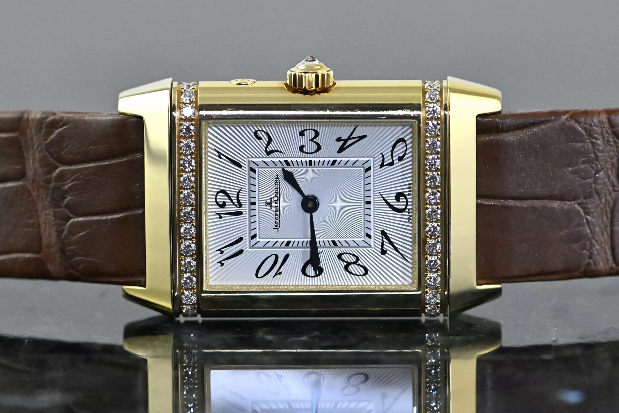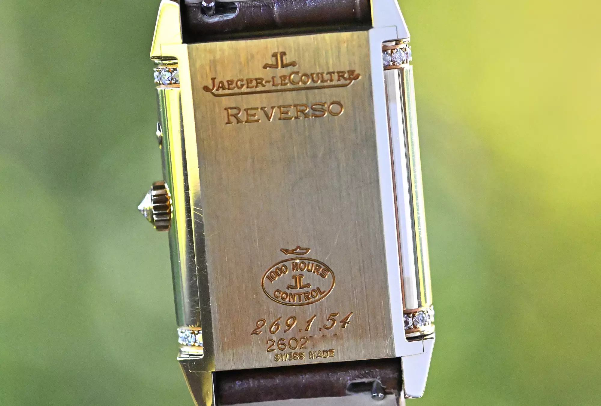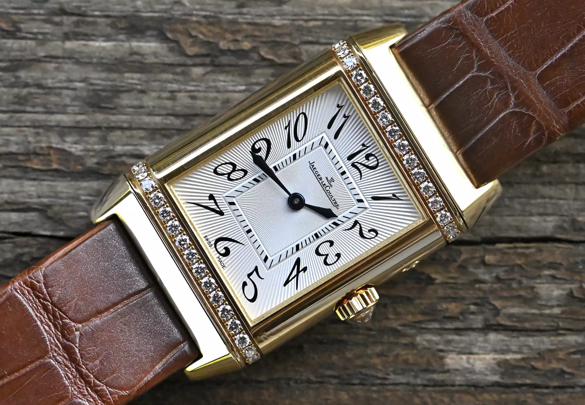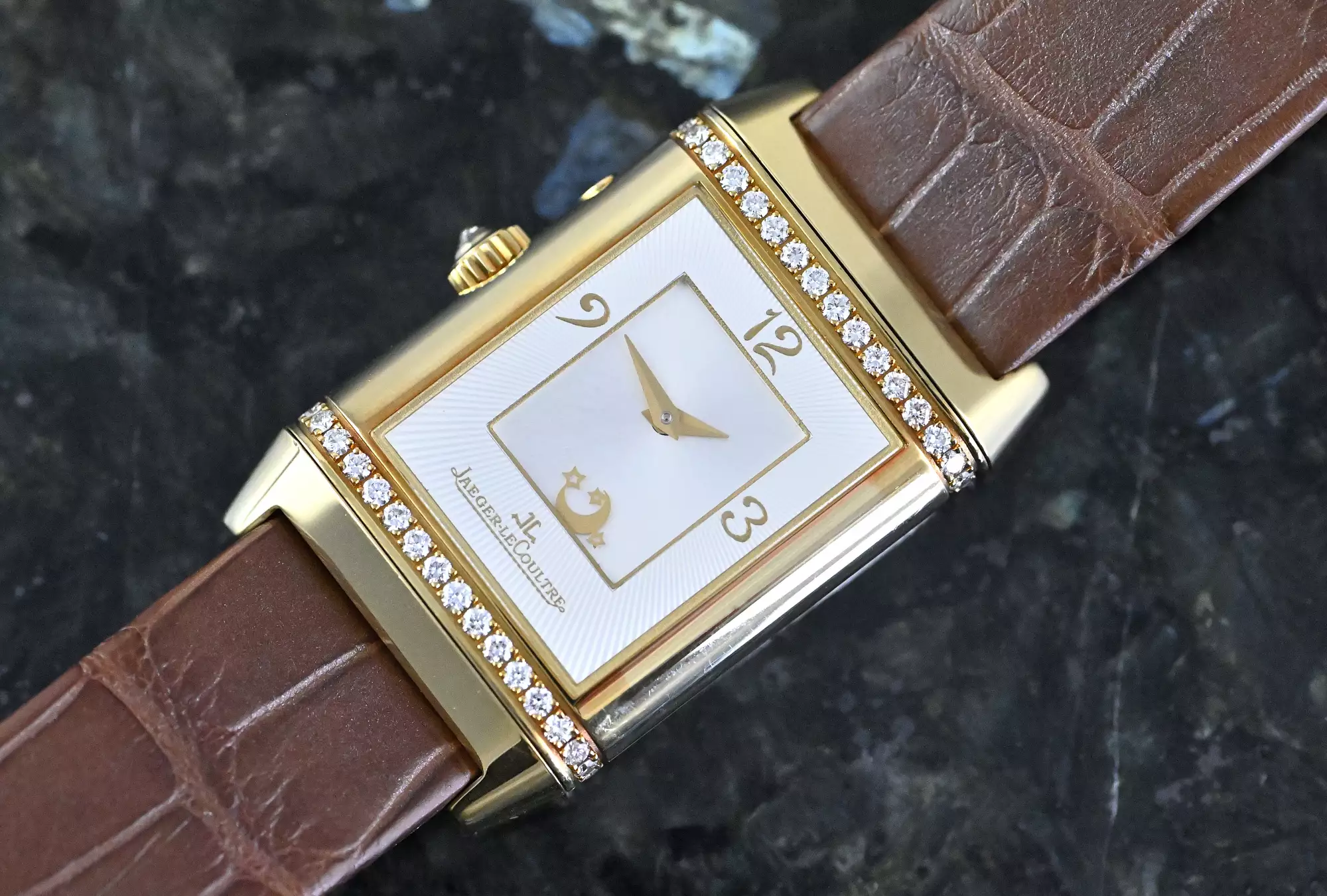 Elegant and stylish Jaeger-LeCoultre Reverso Duetto Duo ‘Diamond’ with reference 269.1.54 - Q2691420 in 18k yellow gold. Both sides of the 180° reversible JLC Reverso case are set with original JLC diamonds (a total of 64 diamonds on the front and back with approx. 1 carat), giving the watch a magnificent appearance.