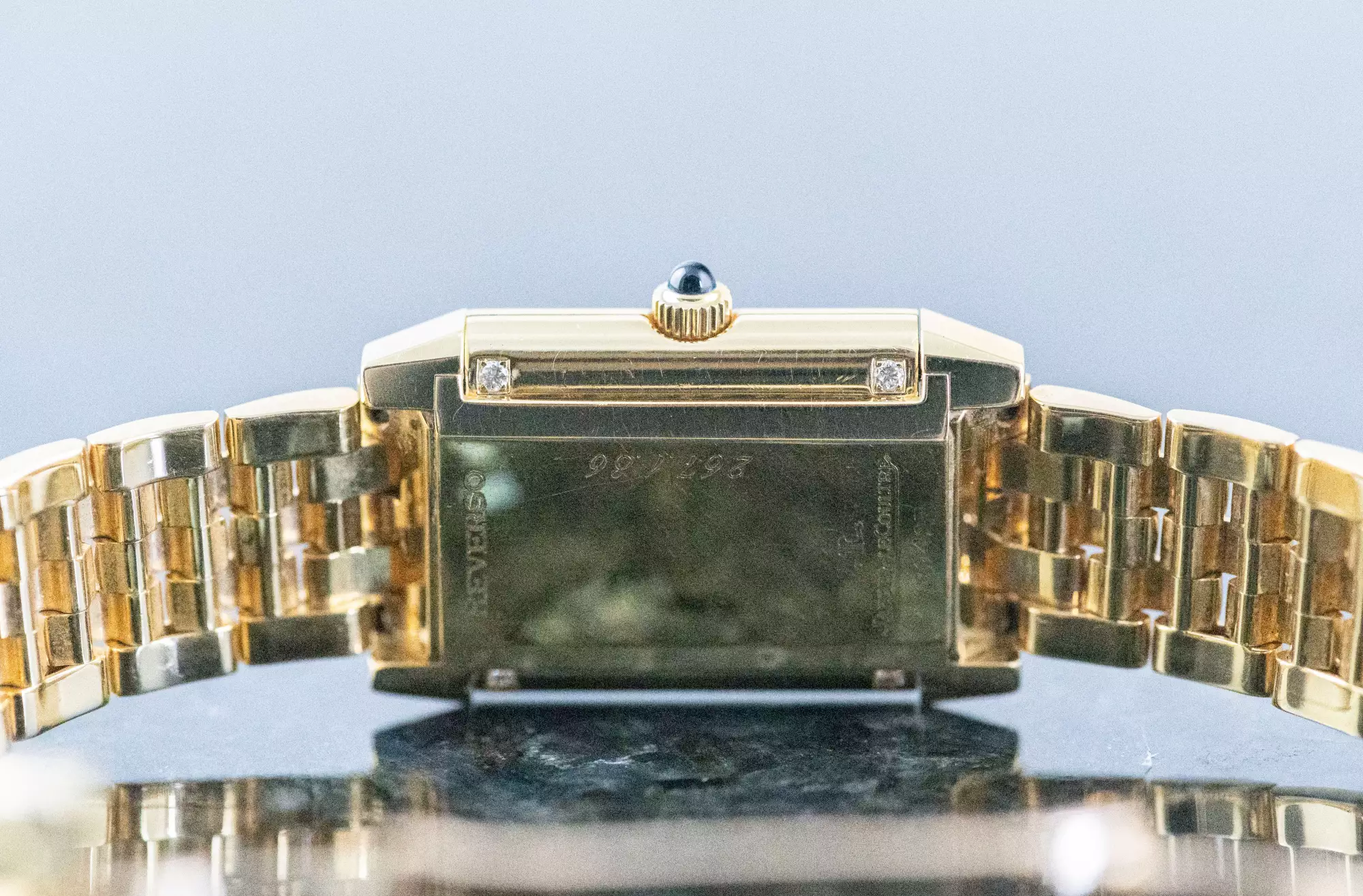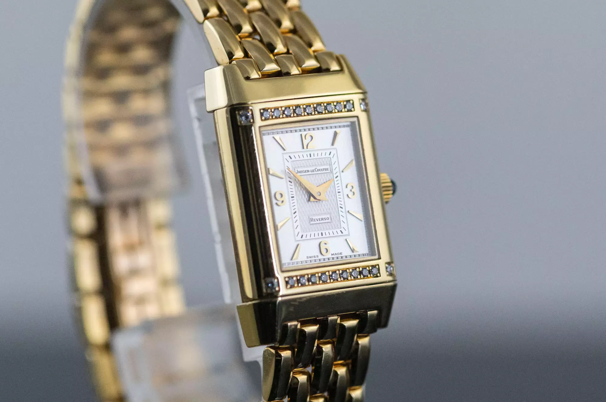 Since its launch in 1931, the JLC Reverso has had a reversible case that can be swivelled through 180°. The dimensions of the watch are 21 x 33 mm, making it a beautiful ladies' size. The watch has the original JLC gold bracelet with double folding clasp in 18k yellow gold, the weight of the watch is 107.1 grams.
