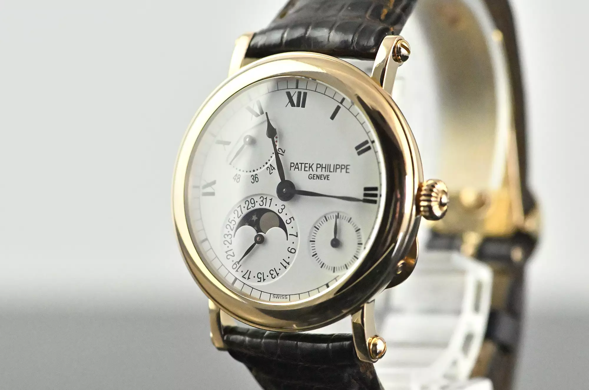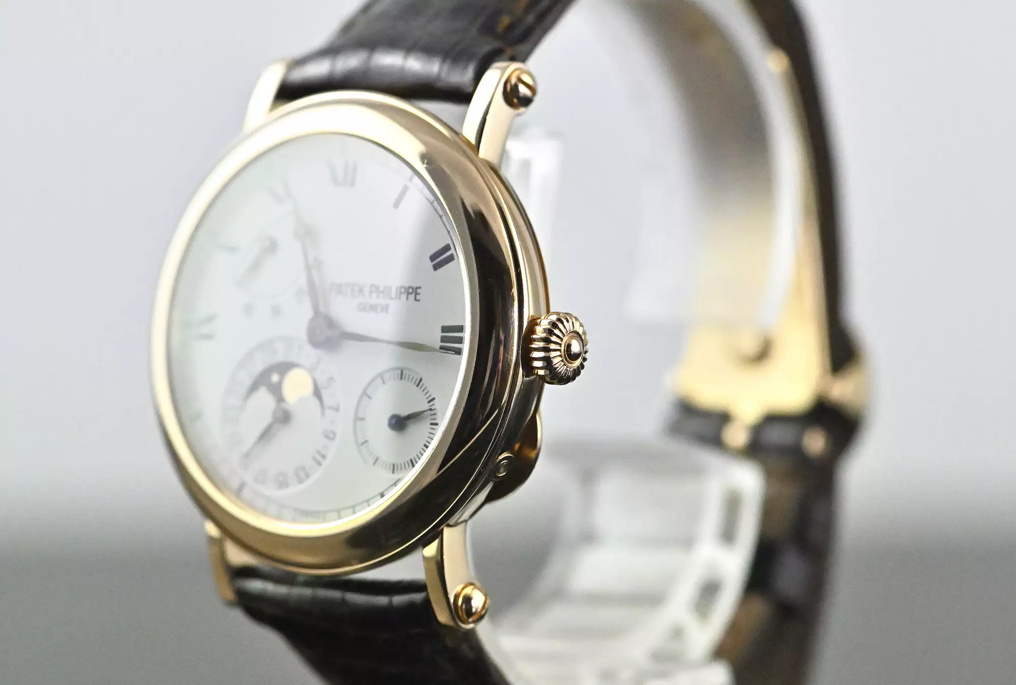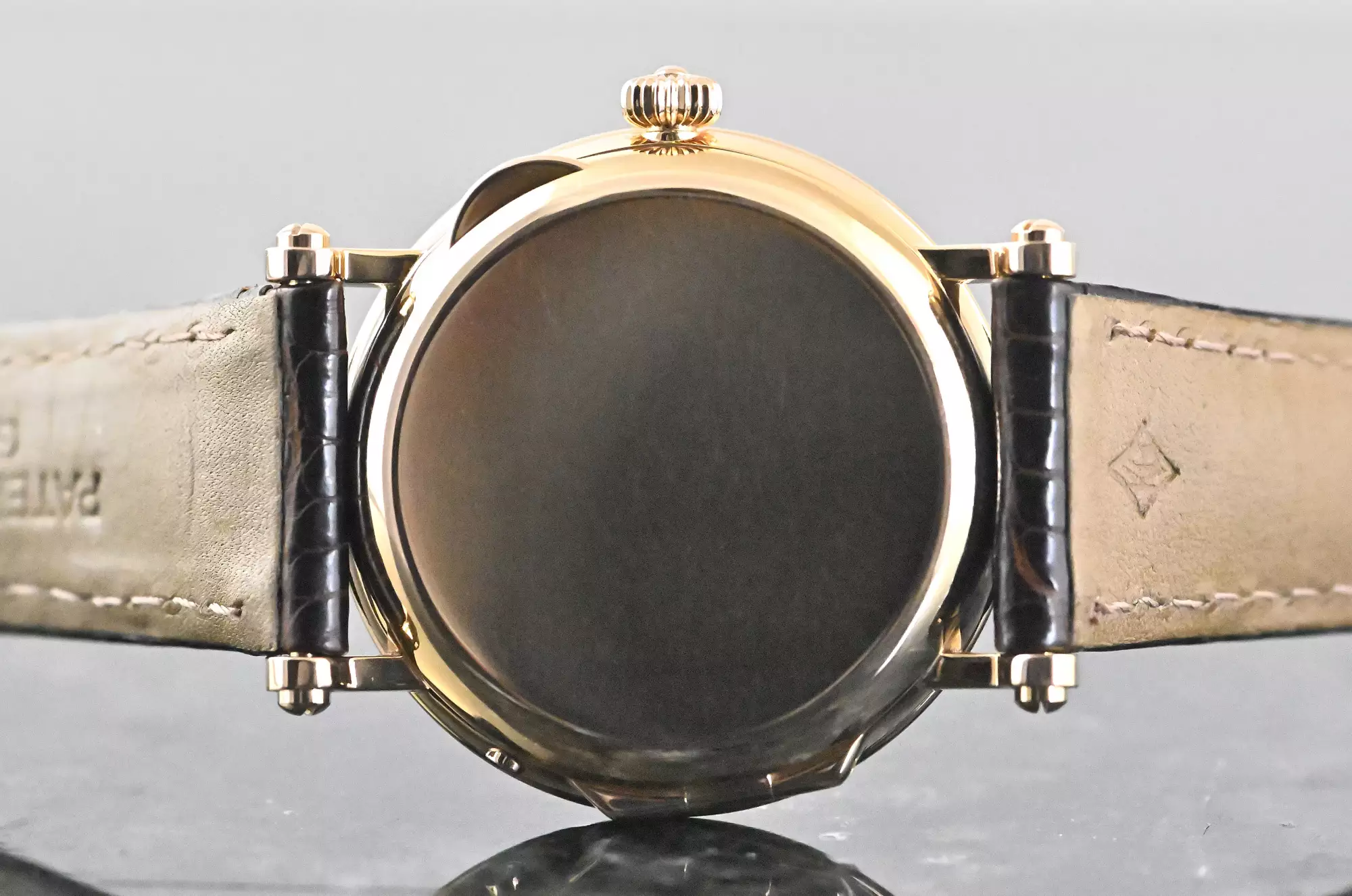 Reference 5054 was produced from 1999 to 2005 in three gold versions (yellow, white and rose gold) and platinum. Collectors consider the rose gold version and the platinum version to be the rarest and most visually appealing versions. An interesting comparison can be drawn with the iconic Nautilus 5712, which uses the same calibre with an identical dial layout. While the 5712 has gained enormous popularity in recent years, primarily due to the general popularity of the Nautilus, the 5054 embodies the classic and discreet alternative - more elegant, more restrained and, thanks to the officer's case with hinged back, entirely in the tradition of fine watchmaking. Other striking features of the officer's case are the solid screw-down case lugs and the characteristic onion crown.
