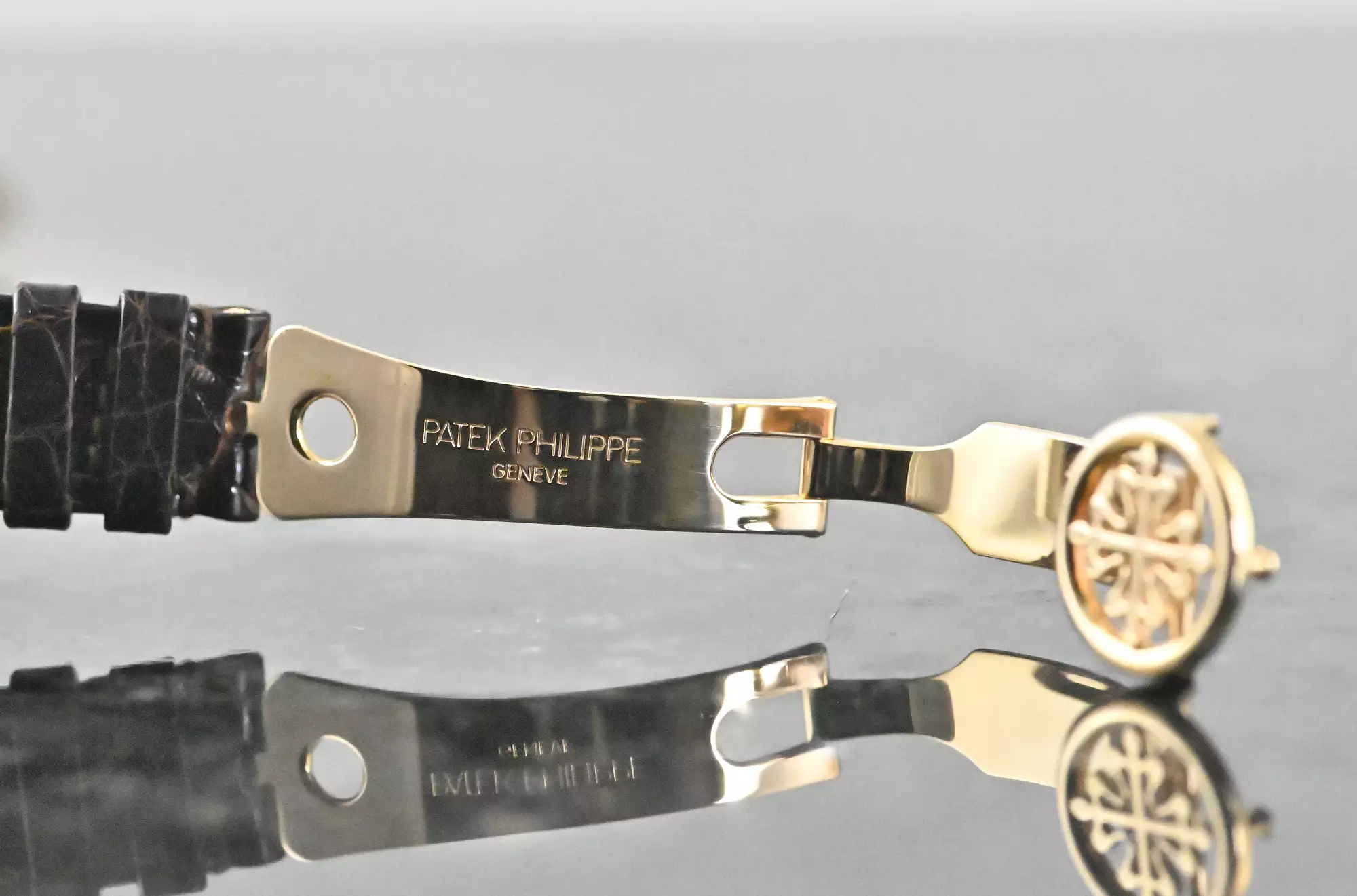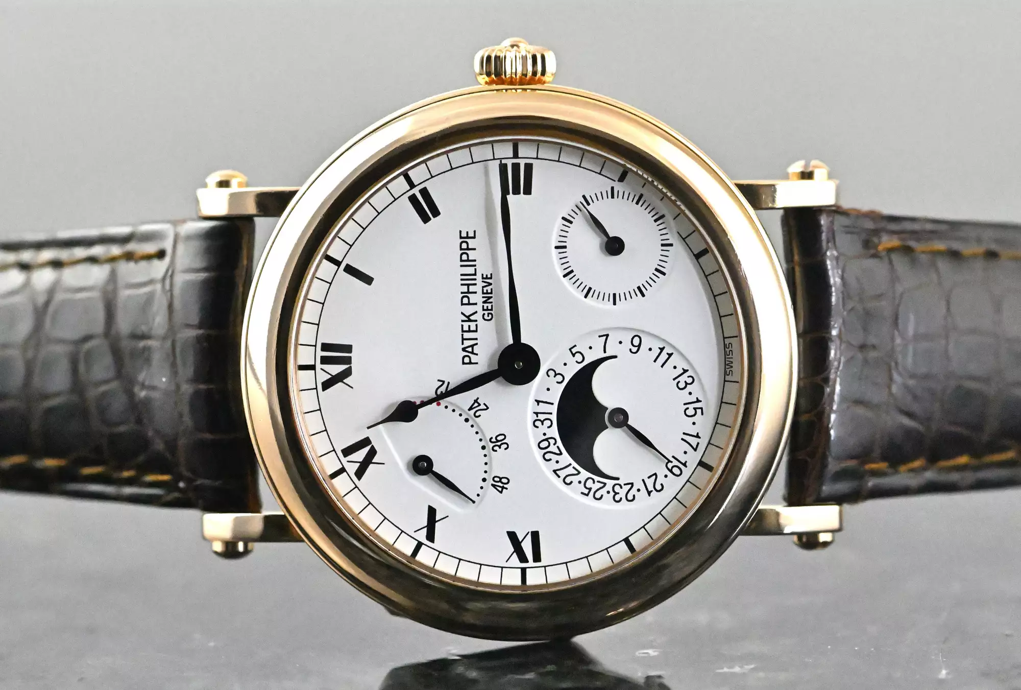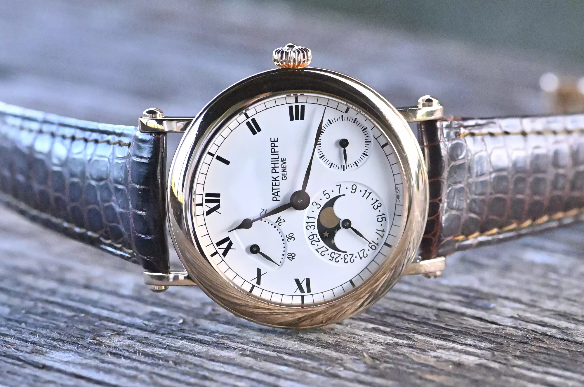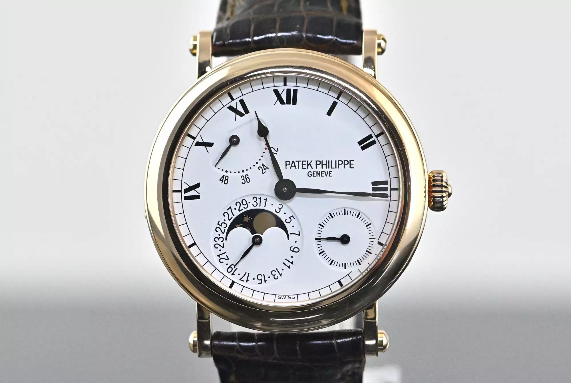 Reference 5054 was produced from 1999 to 2005 in three gold versions (yellow, white and rose gold) and platinum. Collectors consider the rose gold version and the platinum version to be the rarest and most visually appealing versions. An interesting comparison can be drawn with the iconic Nautilus 5712, which uses the same calibre with an identical dial layout. While the 5712 has gained enormous popularity in recent years, primarily due to the general popularity of the Nautilus, the 5054 embodies the classic and discreet alternative - more elegant, more restrained and, thanks to the officer's case with hinged back, entirely in the tradition of fine watchmaking. Other striking features of the officer's case are the solid screw-down case lugs and the characteristic onion crown.
