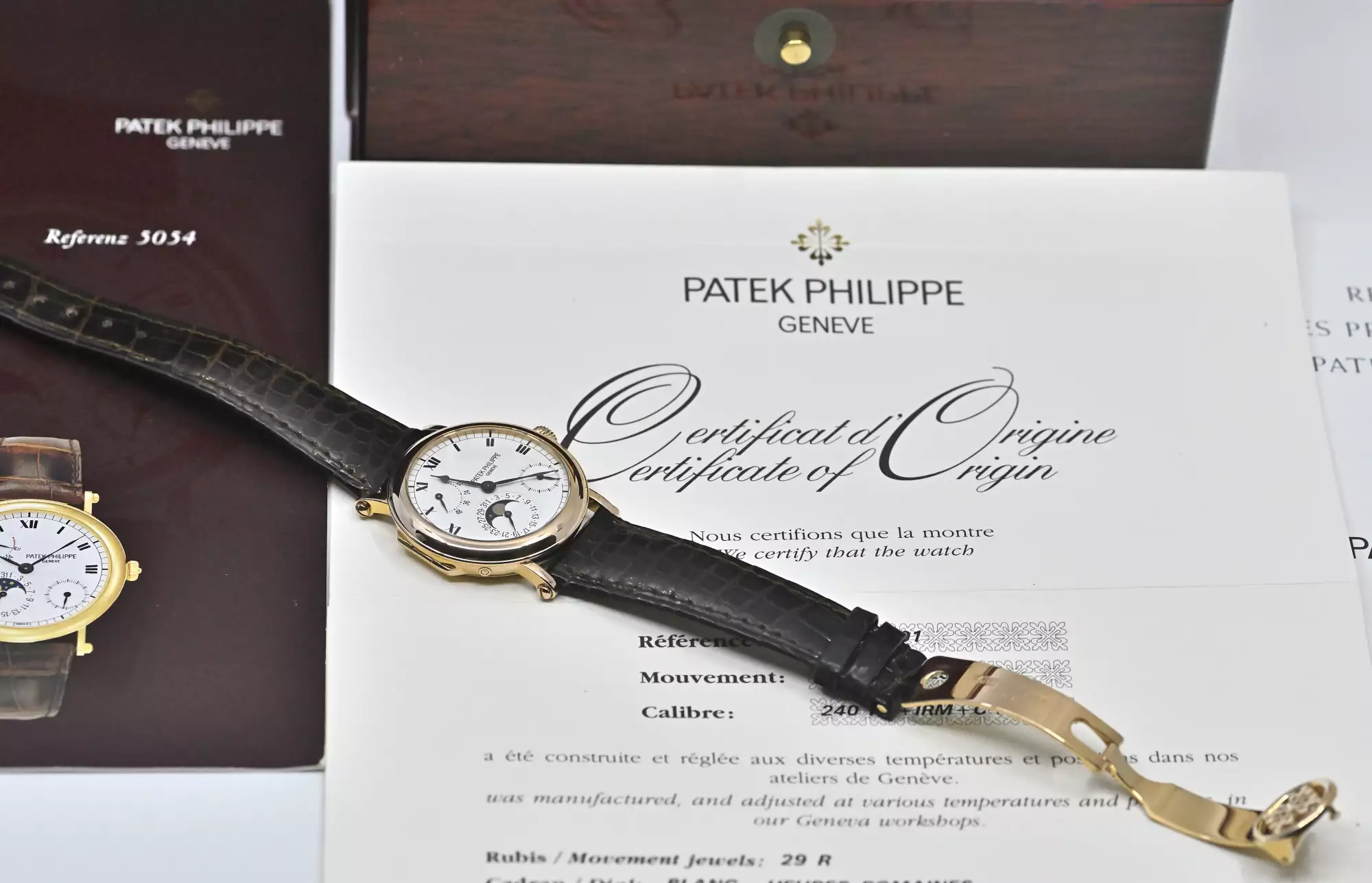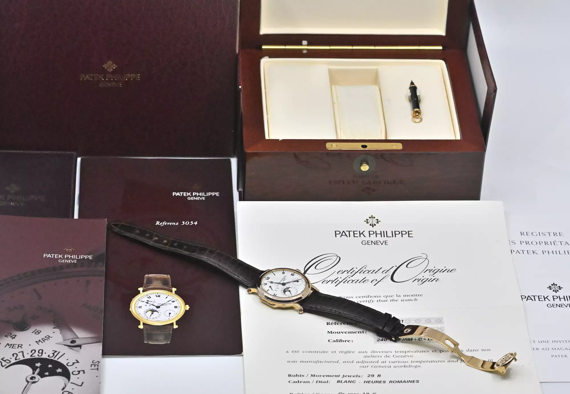 The example presented here is in good worn condition, with only slight signs of wear. The watch is offered with the original Patek Philippe leather strap and a new original PP officer buckle in 18-karat rose gold. Patek Philippe collectors are known for their careful handling, not only of the watch itself, but also of all its accessories. Accordingly, this model presents itself as a particularly well-kept collector's item with rarity value and timeless elegance. This watch is offered as a full set, with the original Patek box and outer carton - original PP guarantee certificate / Certificate of Origin (sold in February 2004 by a German PP concessionaire) - booklet / description of the 5054 - PP leather folder - booklets.