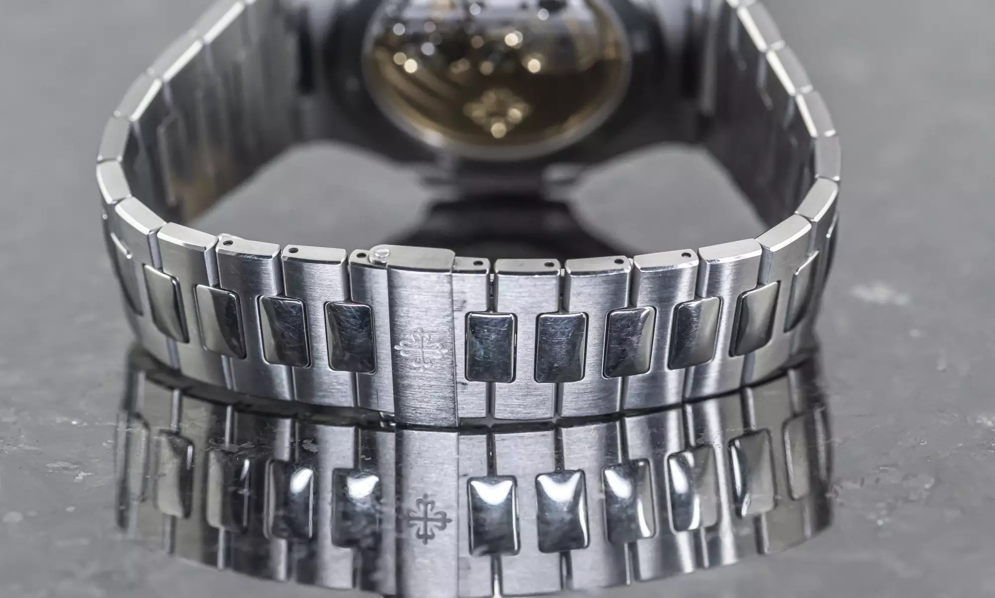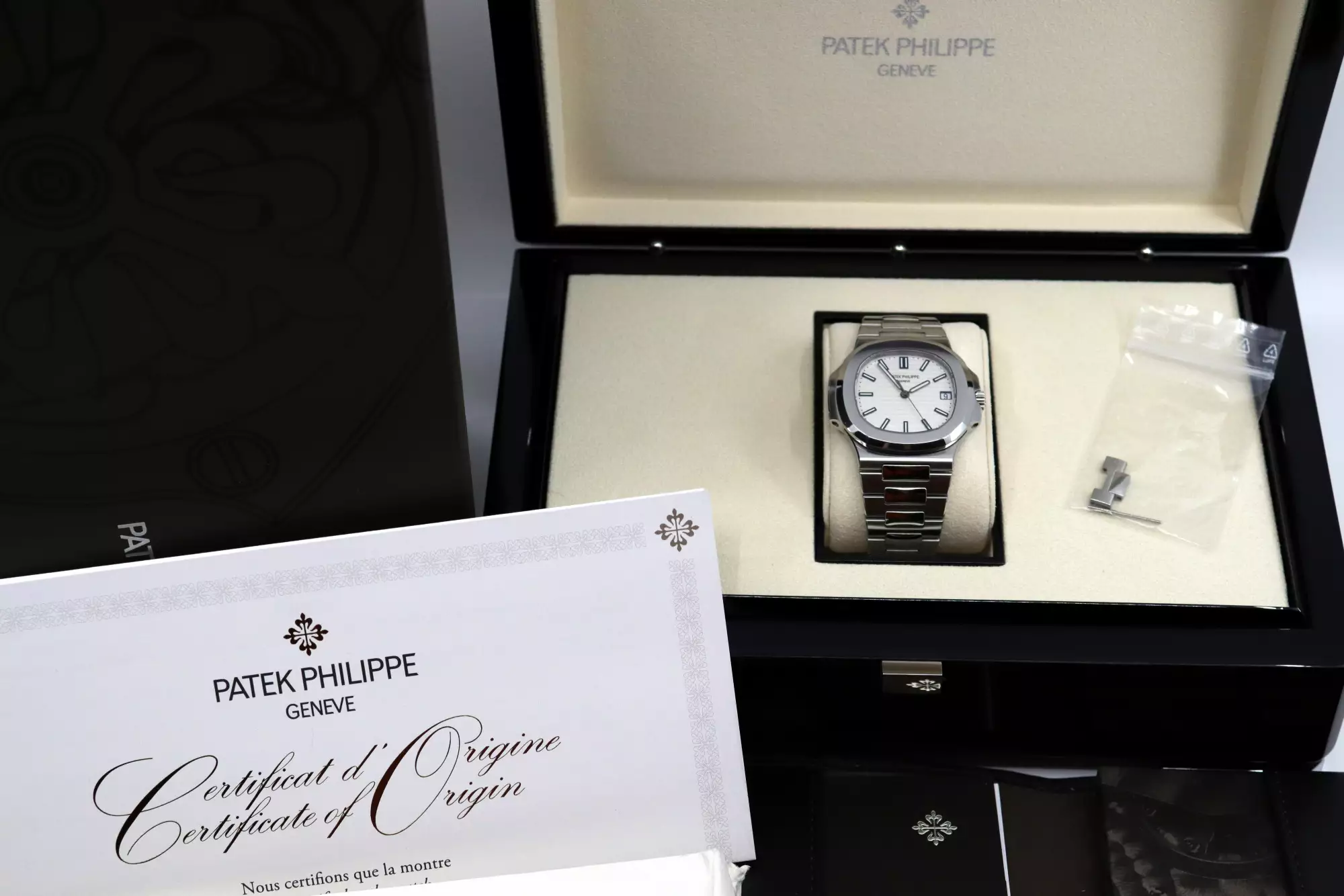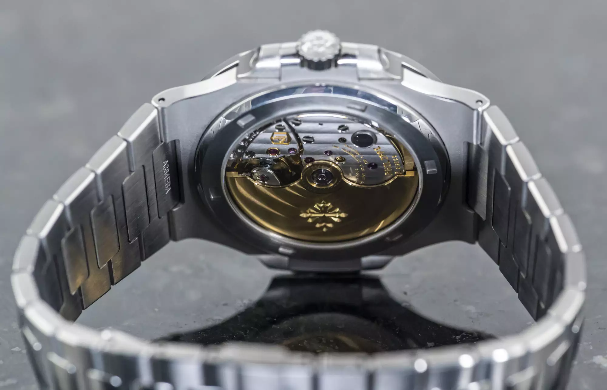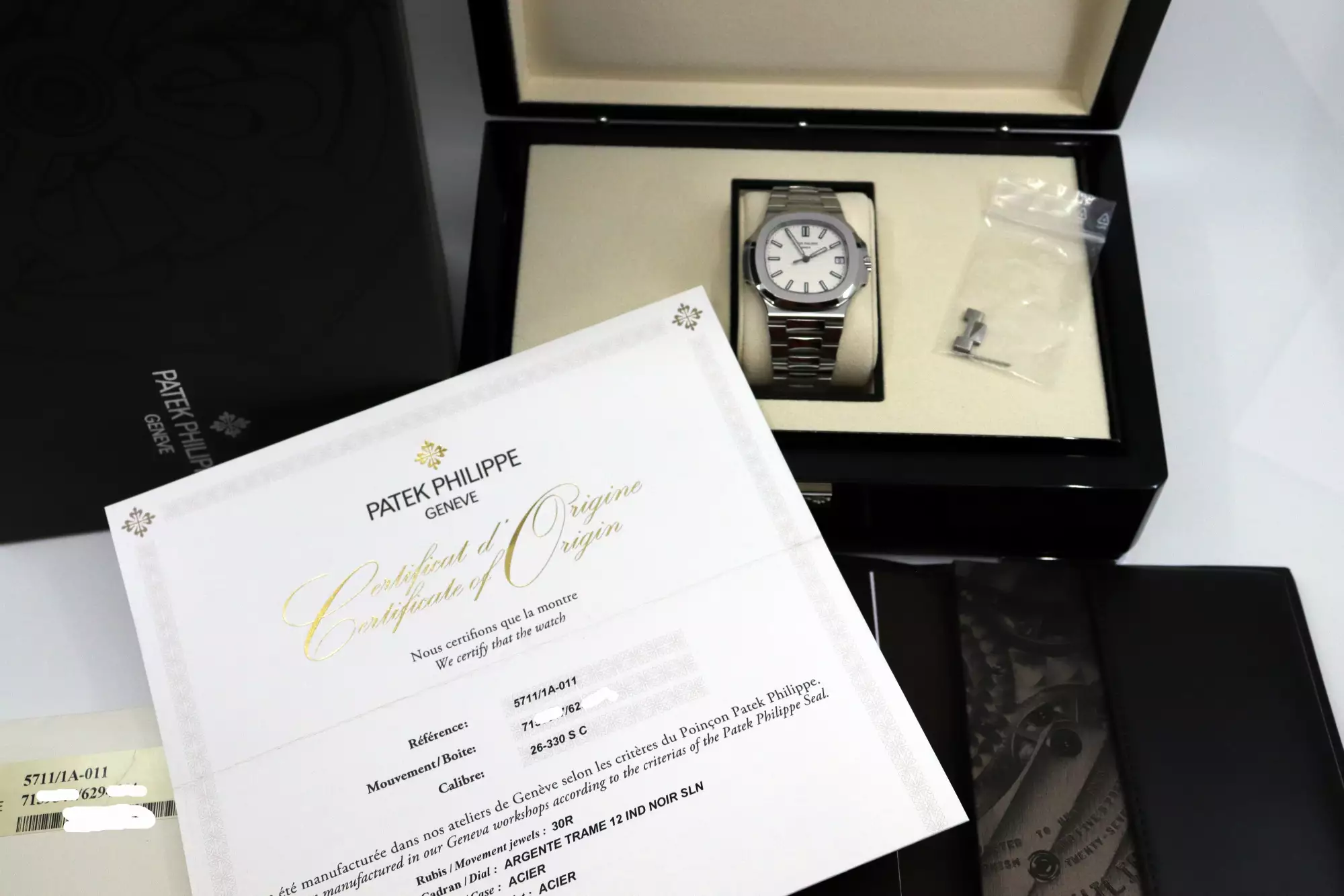 Inside you can find the Patek automatic calibre 26-330 SC with date & central seconds. This calibre was only used in the last watches of the 5711 and in total only 6 months for the version with the white dial. This special feature makes this Nautilus very rare and extremely collectable.