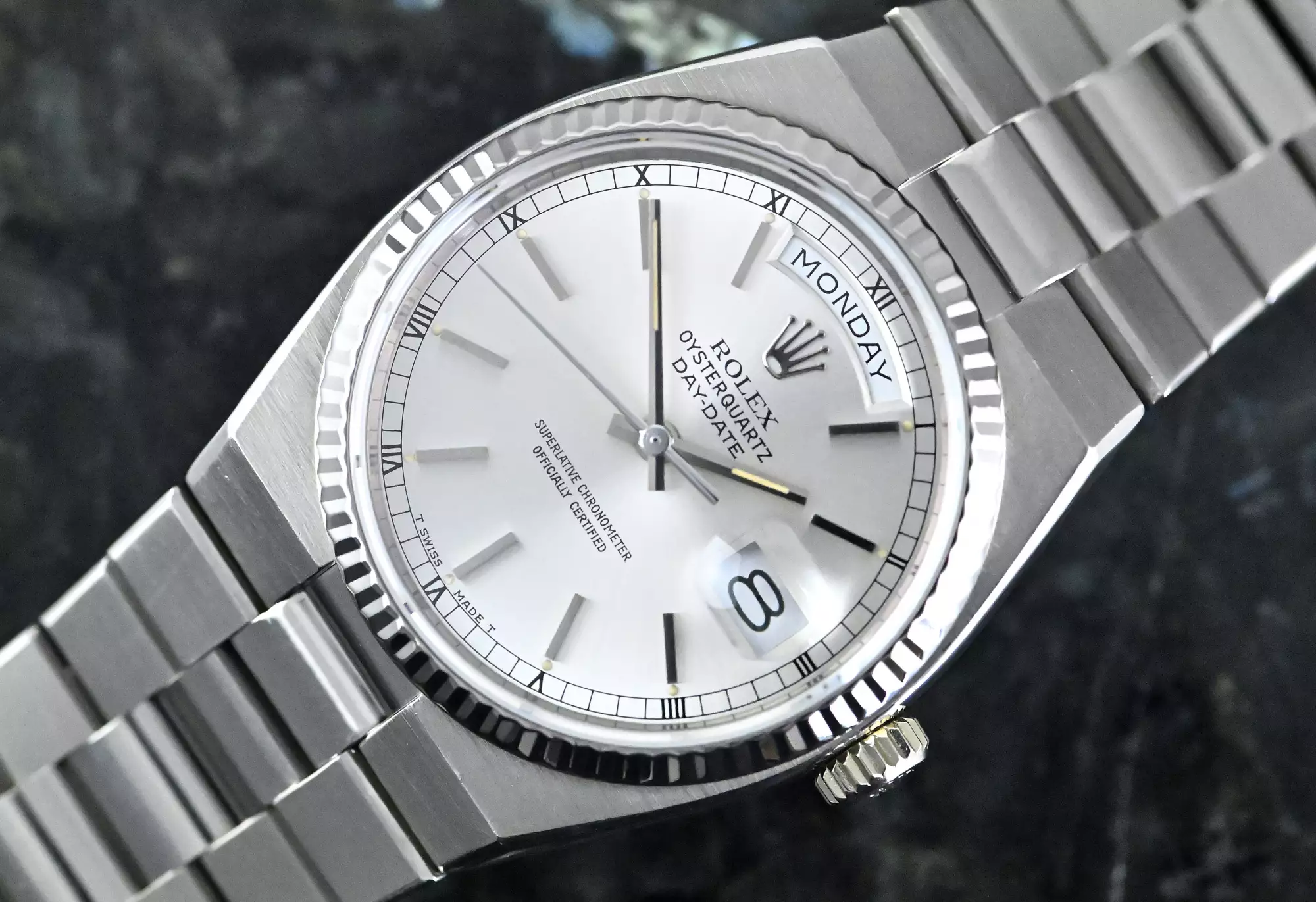 Very rare and special Vintage Rolex Day-Date Oysterquartz with the reference 19019 in 18k white gold. The watch has the serial number 7,148,xxx, meaning it was produced in 1981. The watch has the Rolex Quartz Calibre 5055 movement, which ensures the correct time, day of the week and date – the battery has been recently replaced.