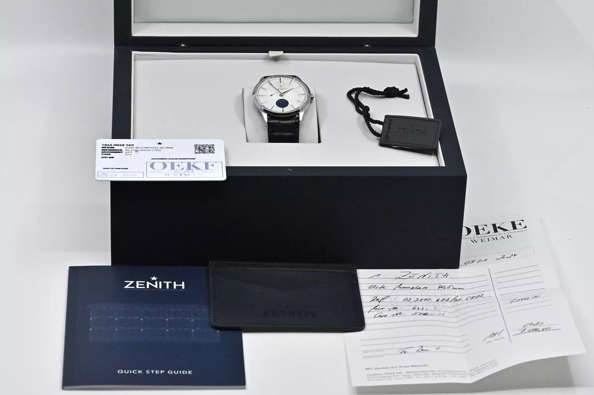 The timepiece comes with the original Zenith leather strap with original Zenith buckle in steel. The diameter of this Elite Moonphase is 40.5 mm. The watch is in good worn condition and comes as a full set with the original Zenith box and outer carton - Zenith warranty card (sold on 25 January 2024 - Germany) - instruction manual - leather sales tag - original purchase receipt - Zenith travel box.